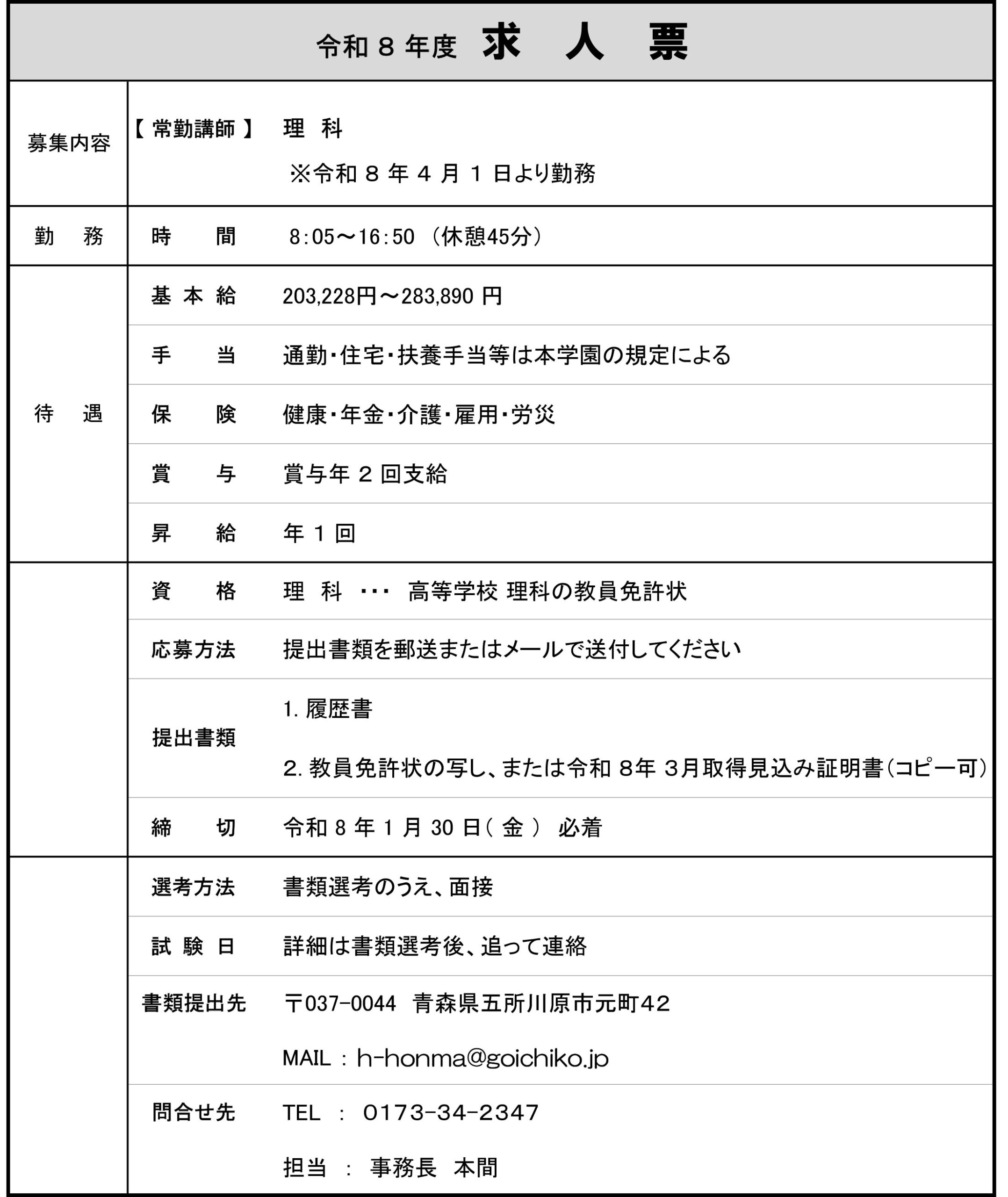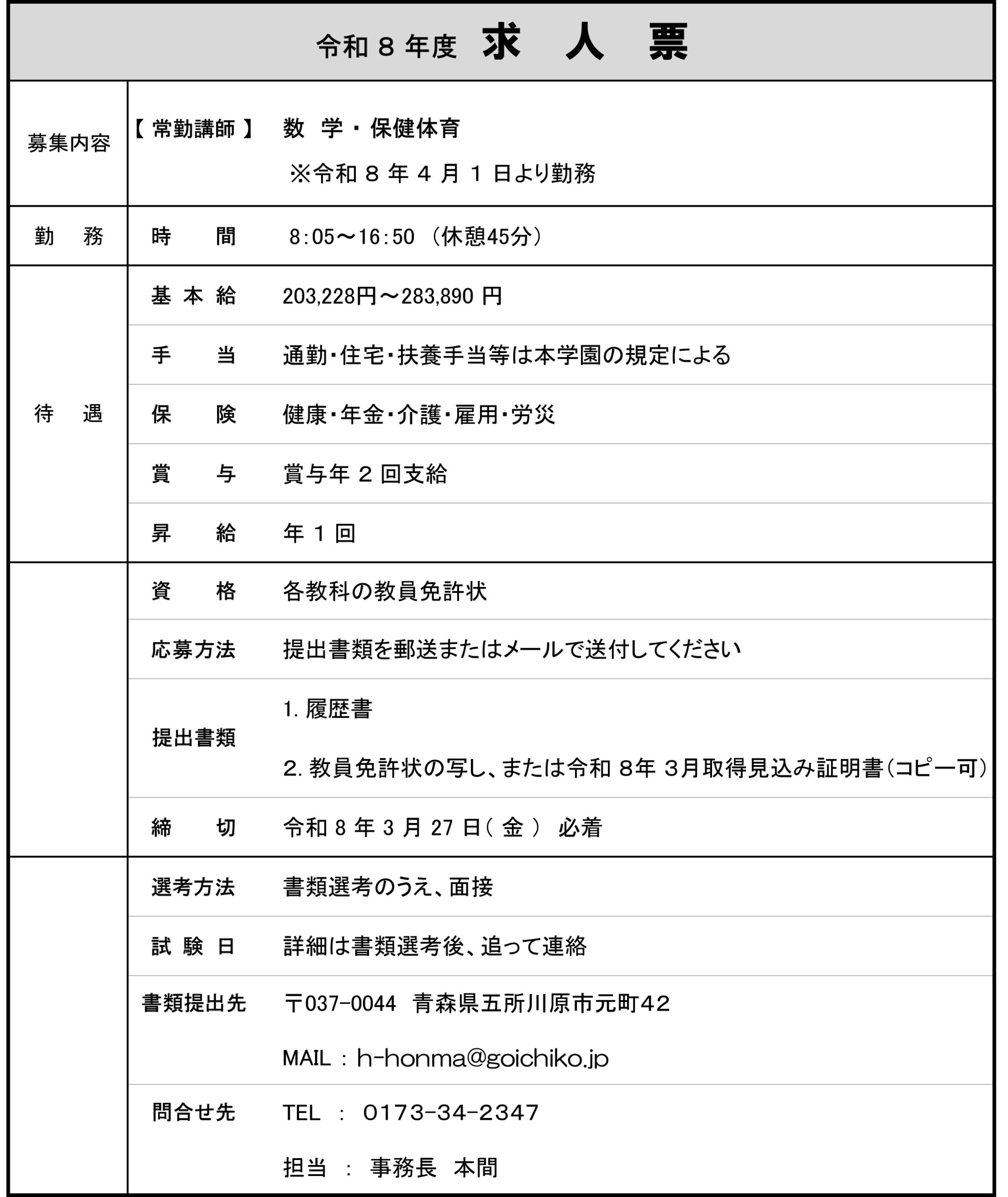 本校では、令和8年度の教員を募集いたしております。以下をご覧いただき、ご応募いただきたいと存じます。どうぞよろしくお願いいたします。