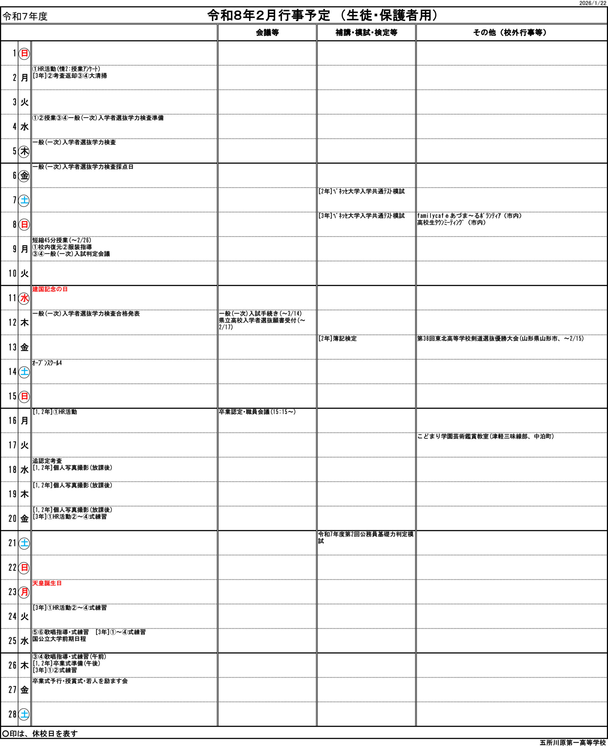 五所川原第一高等学校(全日制)2月行事予定表を掲載しました。