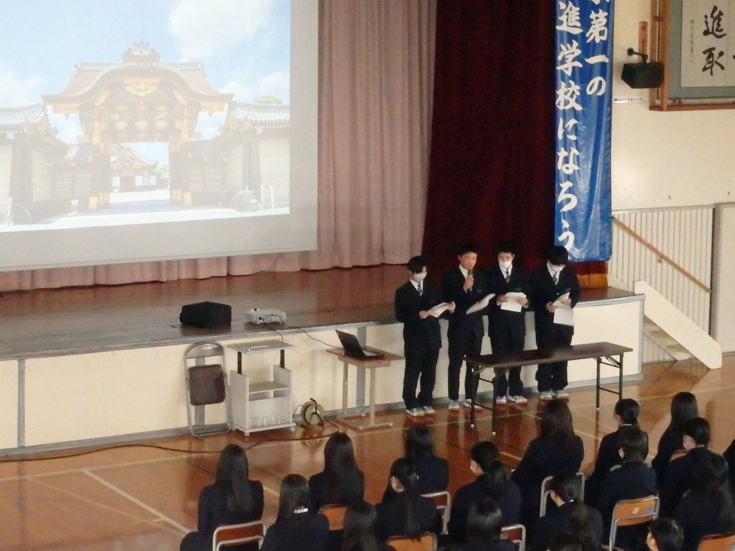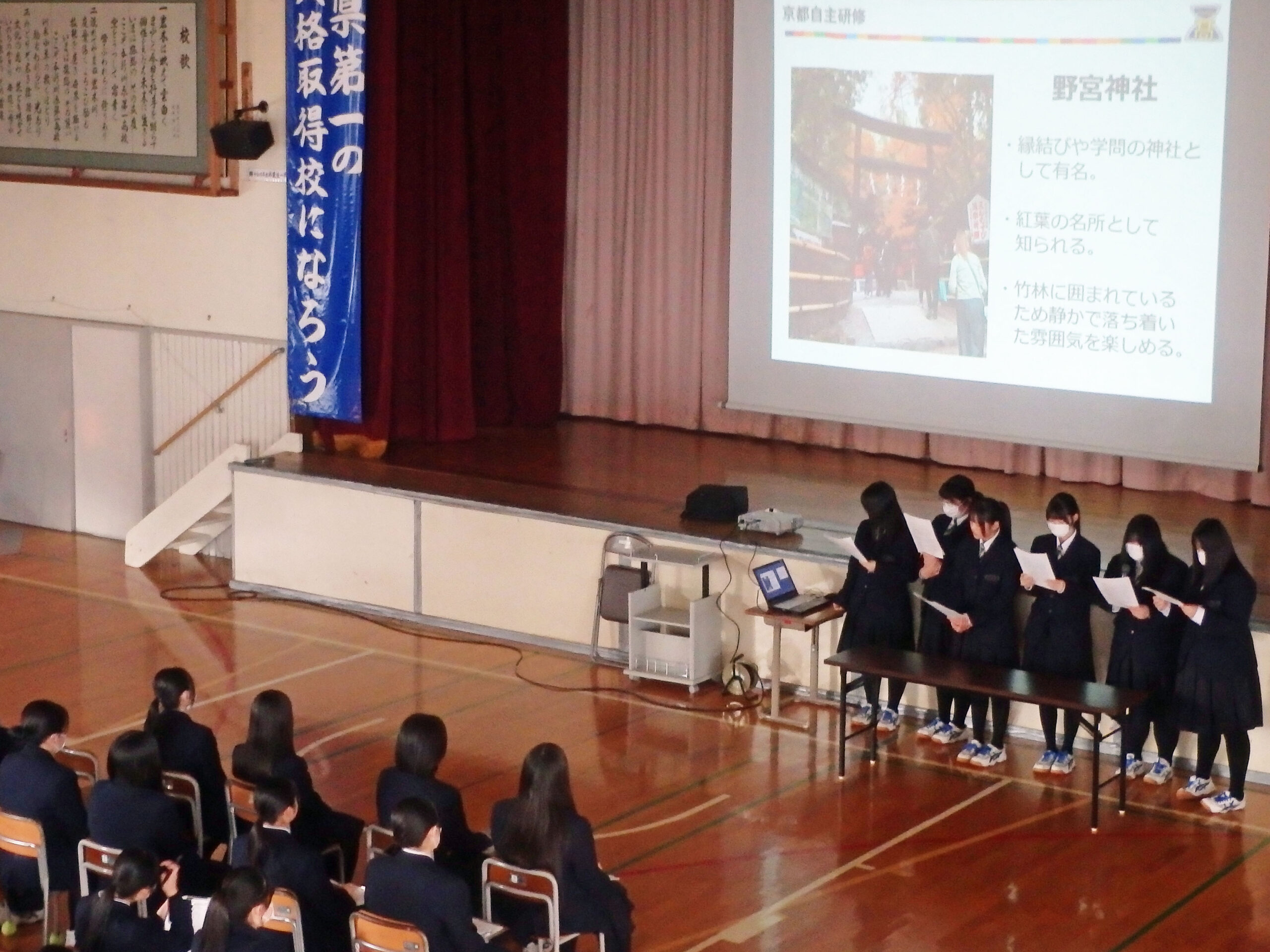 修学旅行の事後報告会を開催しました。各HRの代表2班が、京都市内班別自主研修の活動内容について発表を行いました。